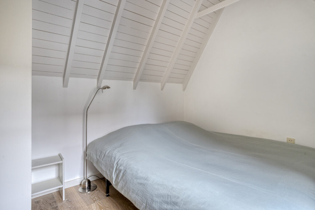 Vanuit de woonkamer loop je terug naar de overloop. Hier vind je links van je, onder het schuine dak, de compacte maar nette badkamer met douche en wastafel. Slim ingedeeld, gezellig afgewerkt en precies passend bij dit huis. Loop je rechtdoor dan vind je de slaapkamer. Verrassend sfeervol, met een fijne inbouwkast en een knusse uitstraling.