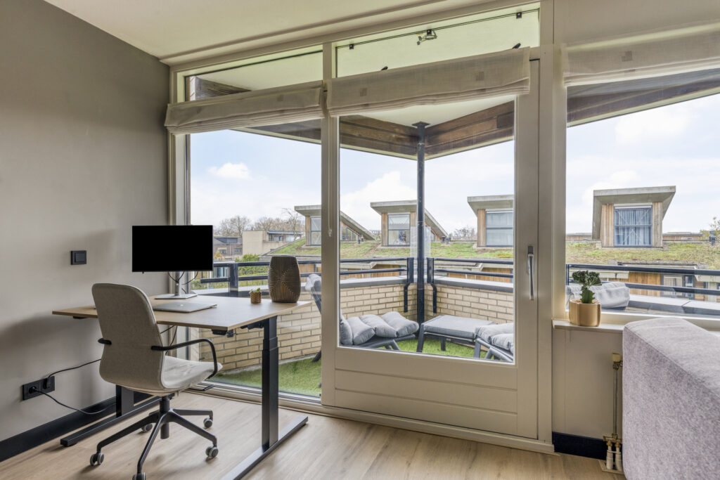 Het balkon op het zuiden is een heerlijke plek om te ontspannen. Dankzij de overkapping kun je hier bijna het hele jaar door genieten van je eigen buitenruimte. Lekker rustig gelegen, met fijne privacy.