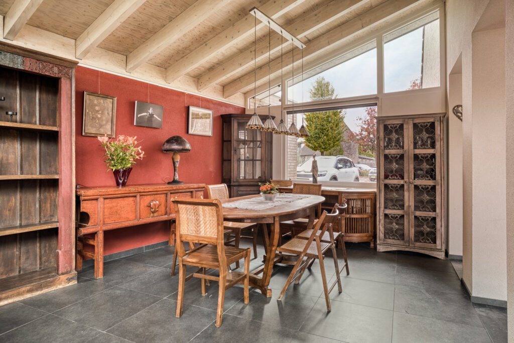 De aanbouw aan de achterzijde is een royale leefruimte waar je volop kunt genieten. Dankzij de hoge plafonds en de grote ramen stroomt het daglicht hier royaal naar binnen. De moderne Stuv-haard maakt het geheel compleet – een heerlijke plek om samen te genieten tijdens lange avonden. De woonkamer is voorzien van een praktisch ophangsysteem voor schilderijen en foto's.