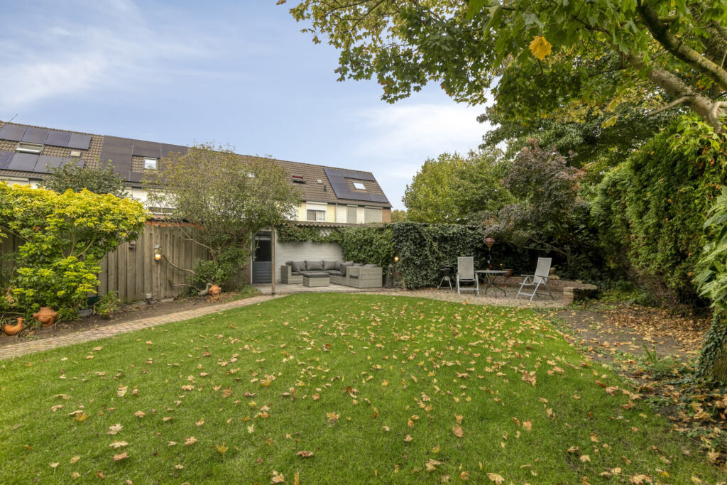 Het prachtige nieuwe gazon nodigt uit om te genieten van het buitenleven. De grote boom in de tuin biedt natuurlijke schaduw op warme dagen. Het ruime grasveld biedt volop ruimte voor kinderen om te spelen. Achter in de tuin staat een ruime schuur voor fietsen en tuingereedschap.
